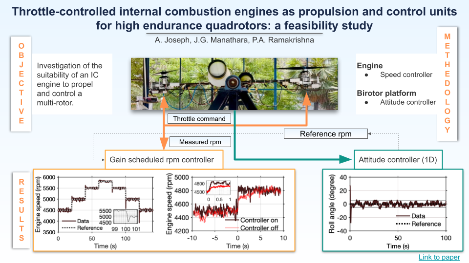 Equipping IC engines for quadrotor control is akin to transforming a marathon runner into a 100-meter sprint champion. That’s the engineering challenge Ajith, a PhD student whom I am co-guiding with Prof. Ramakrishna, tackled in his research, the results of which are published in an article titled “Throttle-controlled internal combustion engines as propulsion and control units for high endurance quadrotors: a feasibility study,” recently published in Aerospace Science and Technology.